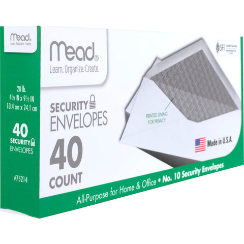 Each #10 envelope measures 4-1/8" x 9-1/2" for mailing standard letter size documents. These Mead envelopes feature a security lining to maintain privacy of documents. All-purpose 20 lb. white envelopes are perfect for home or the office. 40 envelopes per box. SFI Certified Sourcing.