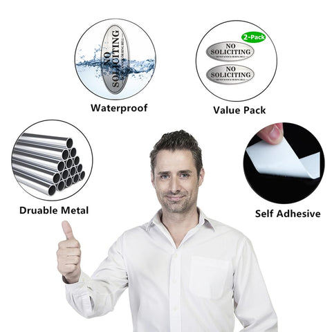 - 1. VALUE PACK OF TWO SIGNS: Your purchase includes 2 No Soliciting Sign for House, which can be placed on your front door, doorbell, mailbox, gate, yard, walkway, window, and more. You can even share them with family and friends. Considering the price for two thick, durable metal signs, you won't regret your choice.