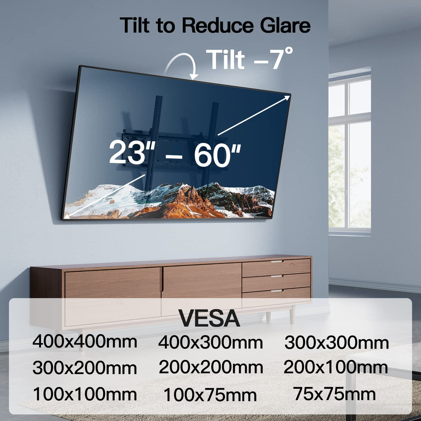 - WIDE DESIGN: The tilted TV wall mount is compatible with most 23" - 60" TVs up to 115lbs / 52 kg, fits 60 inch, 55 inch, 50 inch, 43 inch, 42 inch, 40 inch TVs, etc. with VESA mounting patterns 75x75mm up to 400x400mm. Please check VESA, TV weight, wall stud location and possible blocked cable/input. The tilting TV mount can be installed on 8″, 12″ or 16″ wood studs, concrete, or brick walls. Do not install the mount on drywall alone.