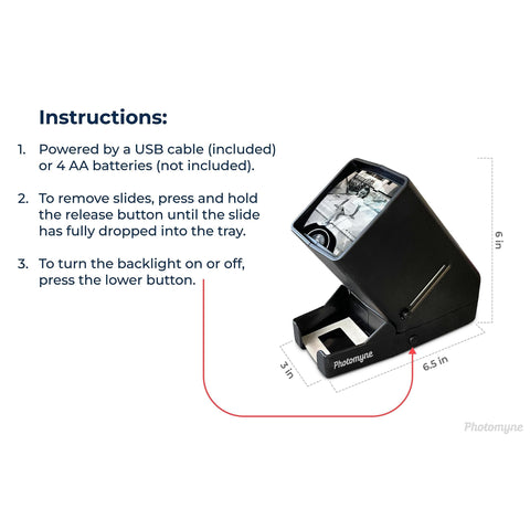 - PORTABLE - Display your slides and negatives anywhere. Battery or USB-powered operation - USB power cable (included) or 4 AA batteries (NOT included).