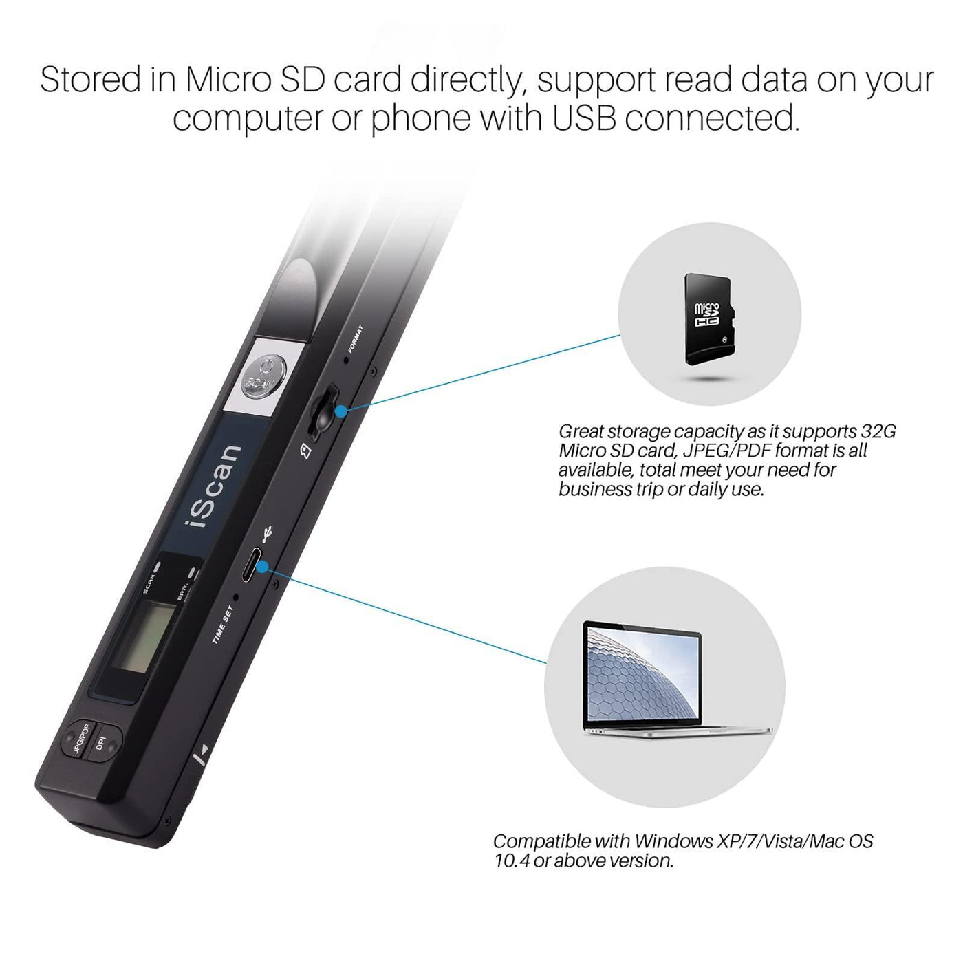 - UP TO 32GB STORAGE - Great storage capacity as it supports 32G Micro SD card, JPEG/PDF format is all available, total meet your need for business trip or daily use. Store and Share your scans and information via searchable PDF files or JPEG into a micro SD/TF card.