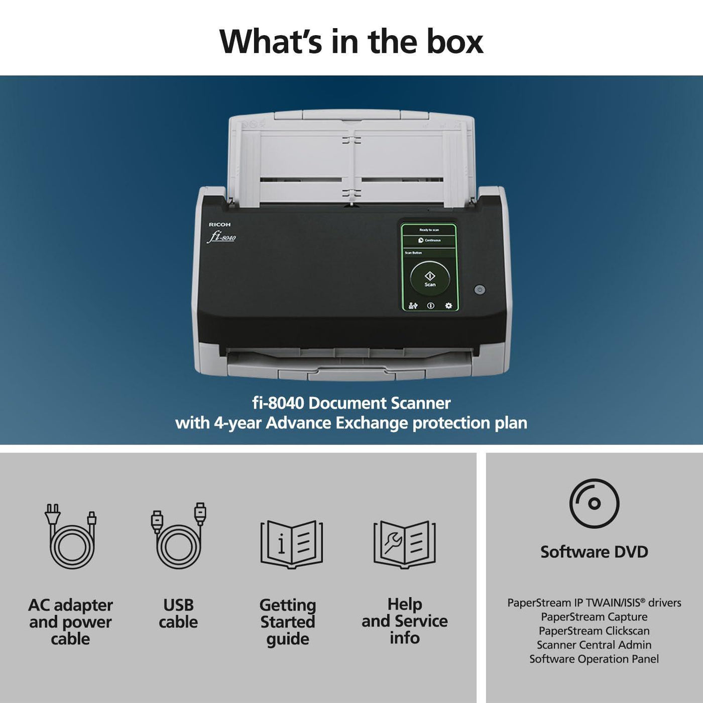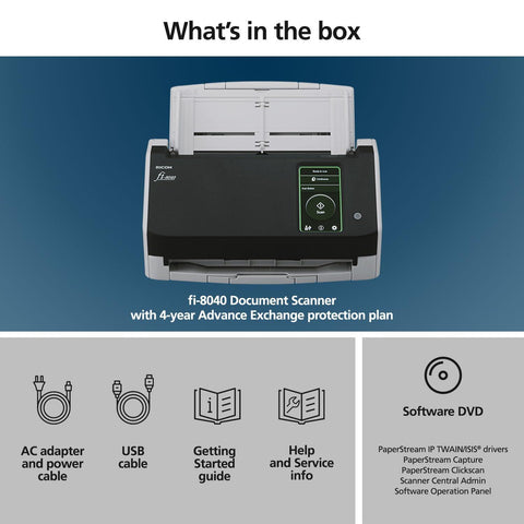 Details: The fi-8040 is an ideal solution for a variety of environments and workflows including accounting, legal, front office reception and patient intake. Its compact size and "DirectScan" functionality make it ideal for crowded work spaces by enabling PC-Less scanning. Replacing the fi-7030, the fi-8040 is nearly 50% faster than its predecessor and is newly equipped with a 4.3- inch touch screen allowing users to easily initiate scans directly to network destinations without the use of a PC. The included easy-to-use PaperStream software interface provides convenient scanning, powerful image enhancement, quick image capture and indexing options. With the upcoming integration of PFU’s PaperStream NX Manager server software, users will enjoy the centralized operation and seamless linkage of their fi-8040 with business applications and cloud services. Additionally, the included manufacturer's 4-year Advance Exchange Warranty ensures optimal uptime and provides peace of mind.