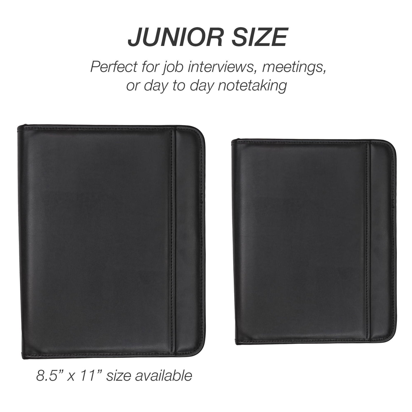 - Junior Zippered Organizer: Our faux-leather junior portfolio with zipper measure 11 x 8.5 inches combining incredible utility, timeless style, and class to produce the only resume portfolio/business portfolio you'll ever need