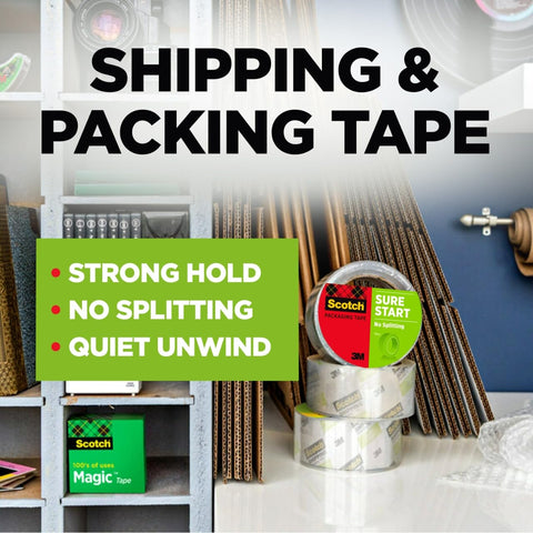 Details: Scotch Sure Start Packing Tape comes off the roll easily and smoothly with no slivering or splitting, so you can skip the frustration and get to taping faster. This shipping and moving tape boasts a strong, durable hold that keeps your packages and boxes securely sealed. Never lose the end of the tape again with this Scotch Packing Tape that offers an easy start every time. Whether you're shipping gifts, moving across the country or packing away seasonal decorations, count on this adhesive tape to keep boxes closed, even with rough handling. Each roll of packaging tape unwinds quietly and easily, making it essential for a home or office setting where quiet is critical. This shipping tape has a release coating that helps ensure it unwinds smoothly in one piece, not in little strips. Each roll of packaging protection tape is 1.88 in. x 54.6 yd., on a 3-in. core.