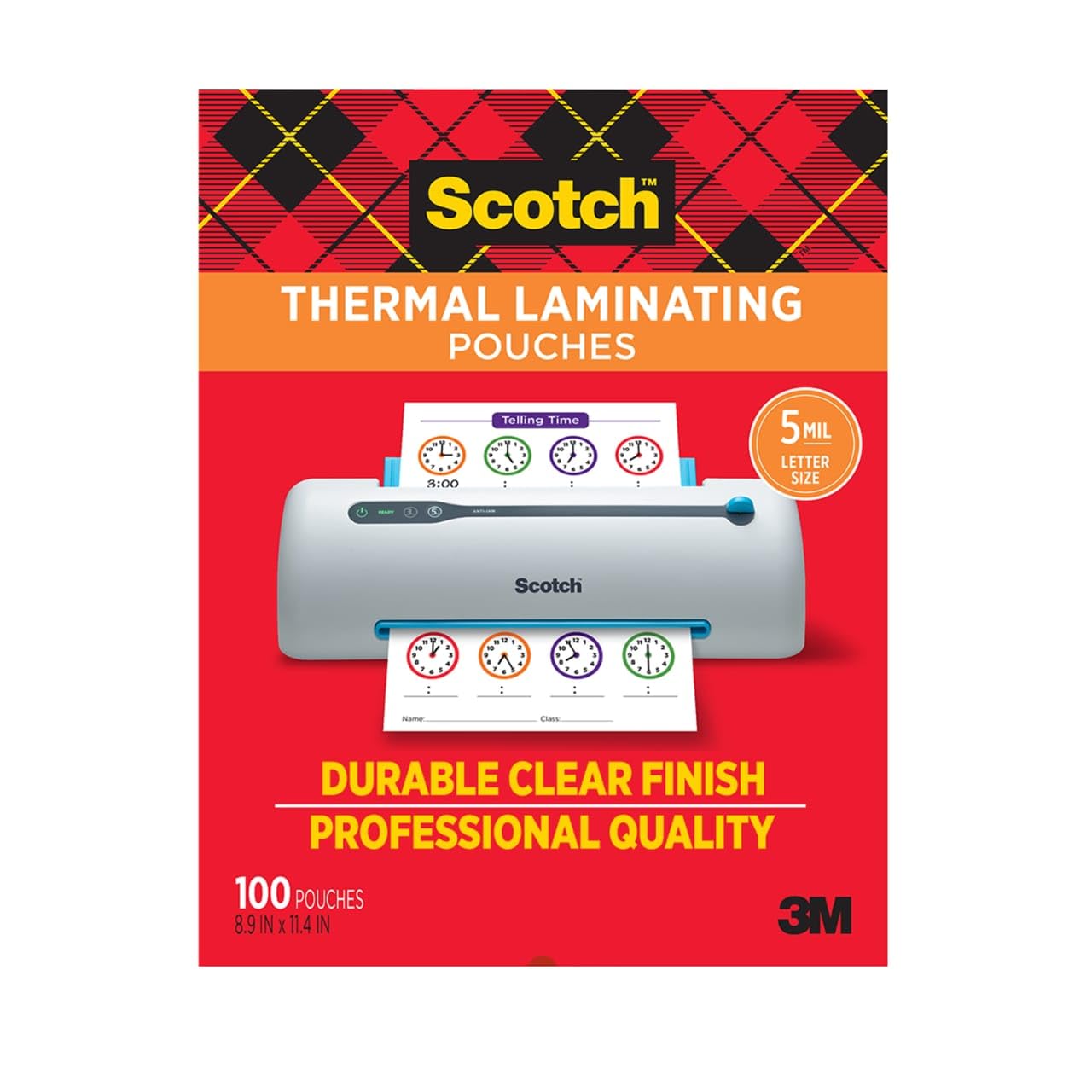 - THERMAL LAMINATING POUCHES: One 100-count package of Scotch Thermal Laminating Pouches, ultra-clear pouches; ideal laminating pouches that protect and add professionalism to documents used frequently