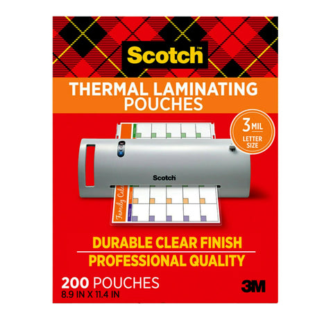 - THERMAL LAMINATING POUCHES: One 200-count package of Scotch Thermal Laminating Pouches, ultra-clear pouches that protect and add professionalism to documents you use frequently
