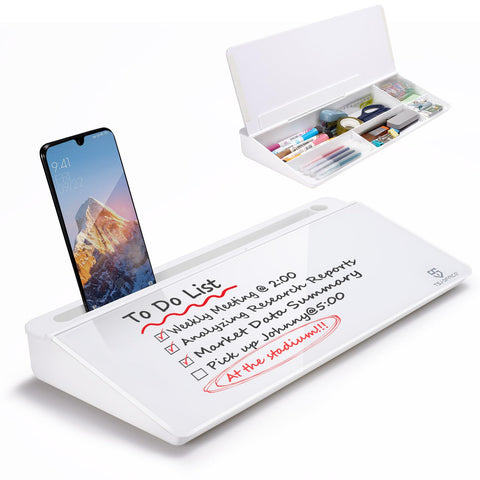- CONTAINS EVERYTHING YOU NEED - This small glass whiteboard kit includes a W 15.8 " x D 7.1 " x H 1.9 " Desktop glass whiteboard, 4 markers and 1 eraser. It comes with everything you need. Enjoy the standing whiteboard as soon as you receive it!