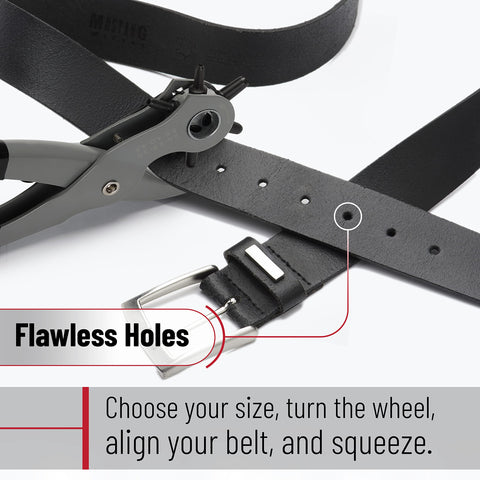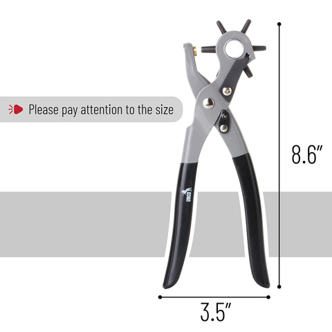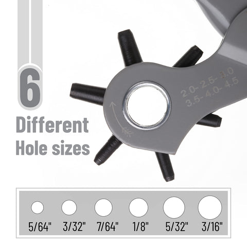 - Convenient, practical, and effective! Just unlock the handle, rotate the wheel to select hole size, align leather subject and squeeze handles.