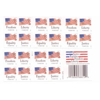 Details: The U.S. Postal service continues its tradition of honoring the stars and stripes with the issuance of the four flags (forever) stamps. This quartet of stamps features a bright U.S. Flag against a white background. A single word appears on each of the four stamps in large letters: Freedom, liberty, equality, and justice. The black typeface recalls the look of colonial-era printing. The current U.S. Flag consists of 13 stripes and 50 stars. Congress passed legislation in 1818 stating that the number of stars on the flag should match the number of states in the union. It also specified that new stars would be added to the flag on the July 4 after a state's admission. The current flag's 50th star was added on July 4, 1960, after Hawai'i became a state on august 21, 1959. The flag illustration by the late Arnold holey well is based on a photograph taken by art director Howard paine. Paine also served as the typographer for the stamp. The "four flags" stamps are being issued as forever stamps in self-adhesive books of 20 and self-adhesive rolls of 100. Forever stamps are always equal in value to the current first-class mail one-ounce rate. Made in the USA.