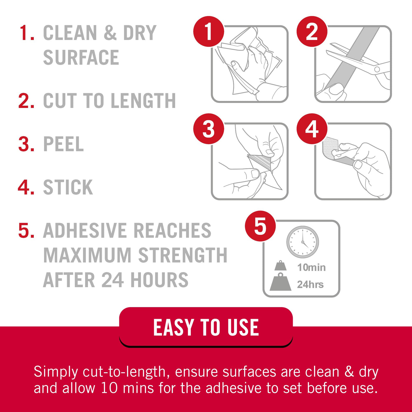 - CUT, PRESS AND SET: Simple to use cut-to-length tape; extend the roll to the desired size, cut, peel off the protective backing, and firmly press to activate adhesive; press hook and loop firmly together for a strong hold
