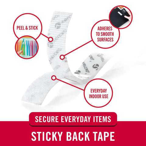 Sticky Back Tape adheres to most smooth surfaces. Use on walls, glass, tile, plastic or metal. Tape works in conjunction with other fasteners or adheres to itself.