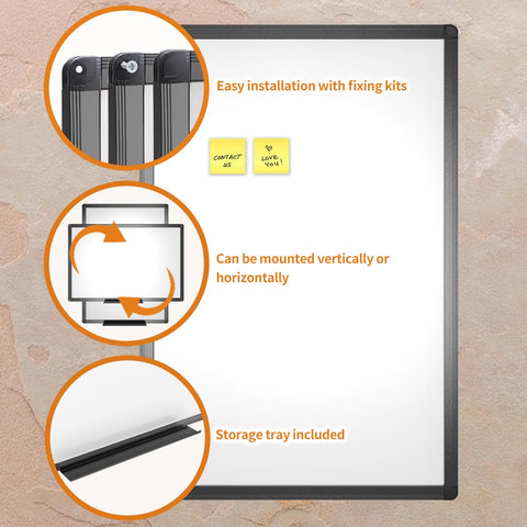 - [High quality Details] Smooth & durable magnetic writing surface, easily dry wipe. Anti-Scratch Black Aluminium frame, ABS plastic corner with screw-fixing in corners, Detachable BLACK Pen Tray.