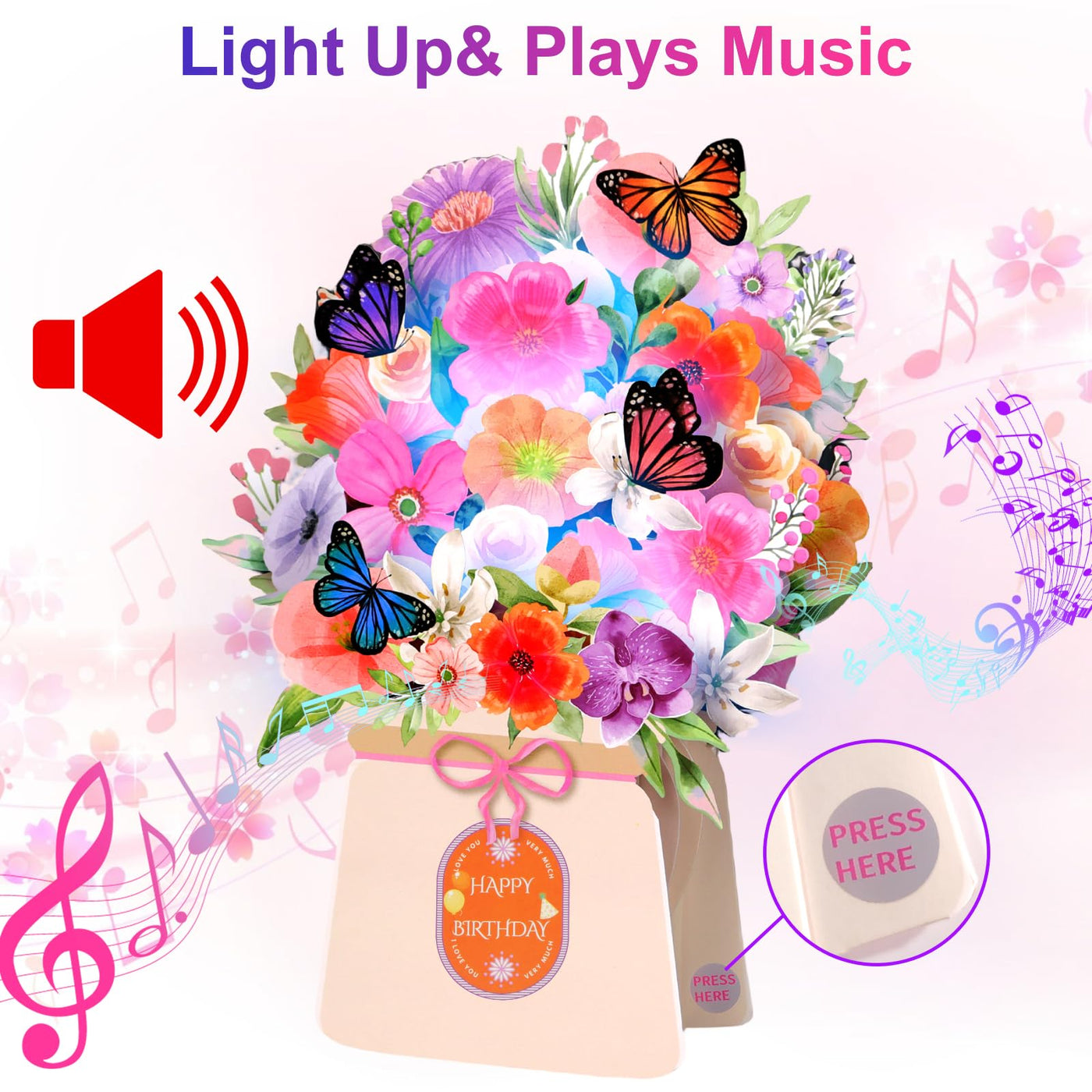 - 【Music and Lighting Design】Open the Birthday card to reveal a life-size permanent bouquet of orchids, lilies and butterflies. The music and lighting design make the birthday card extra special. The vibrant lights and music dance in sync, enhancing the warm atmosphere and making it the best choice for women Birthday gift