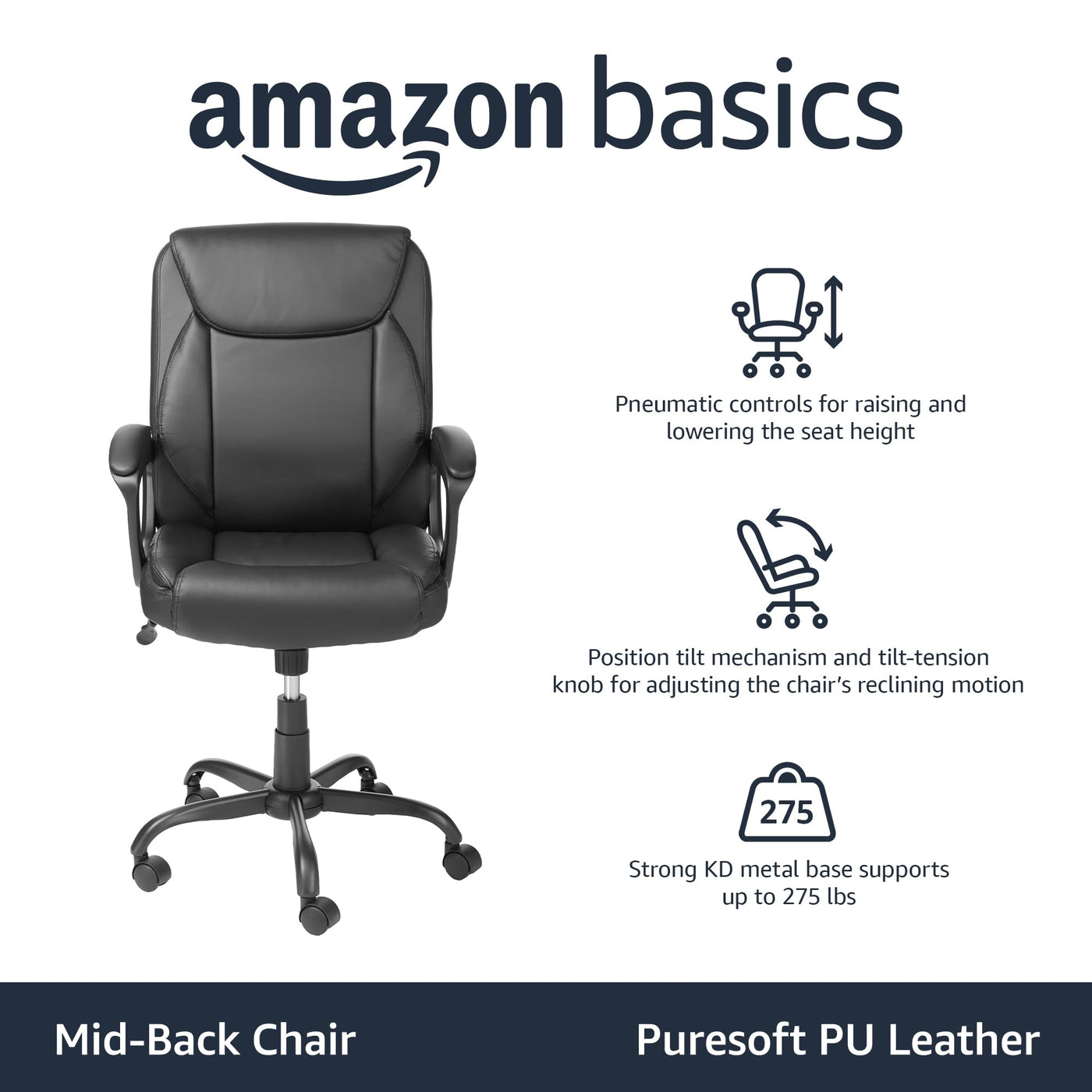 Amazon Basics Classic Puresoft PU-Padded Mid-Back Office Computer Desk Chair with Armrest - Black