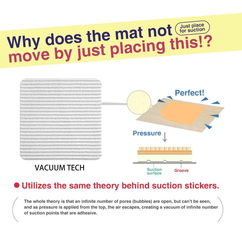 - Design Feature. This product can easily be glued under rug. The side facing the floor features tiny suction pores. These pores utilize the VACUUM TECH feature in which whenever pressure is applied from the top, air escapes and creates a low-pressure region within the cups. This produces an adhesive effect, which keeps your rug in place.