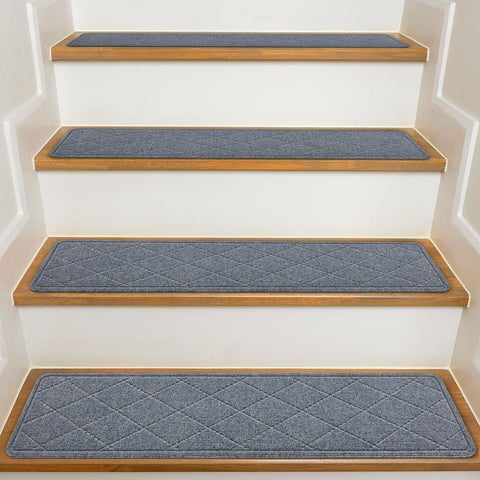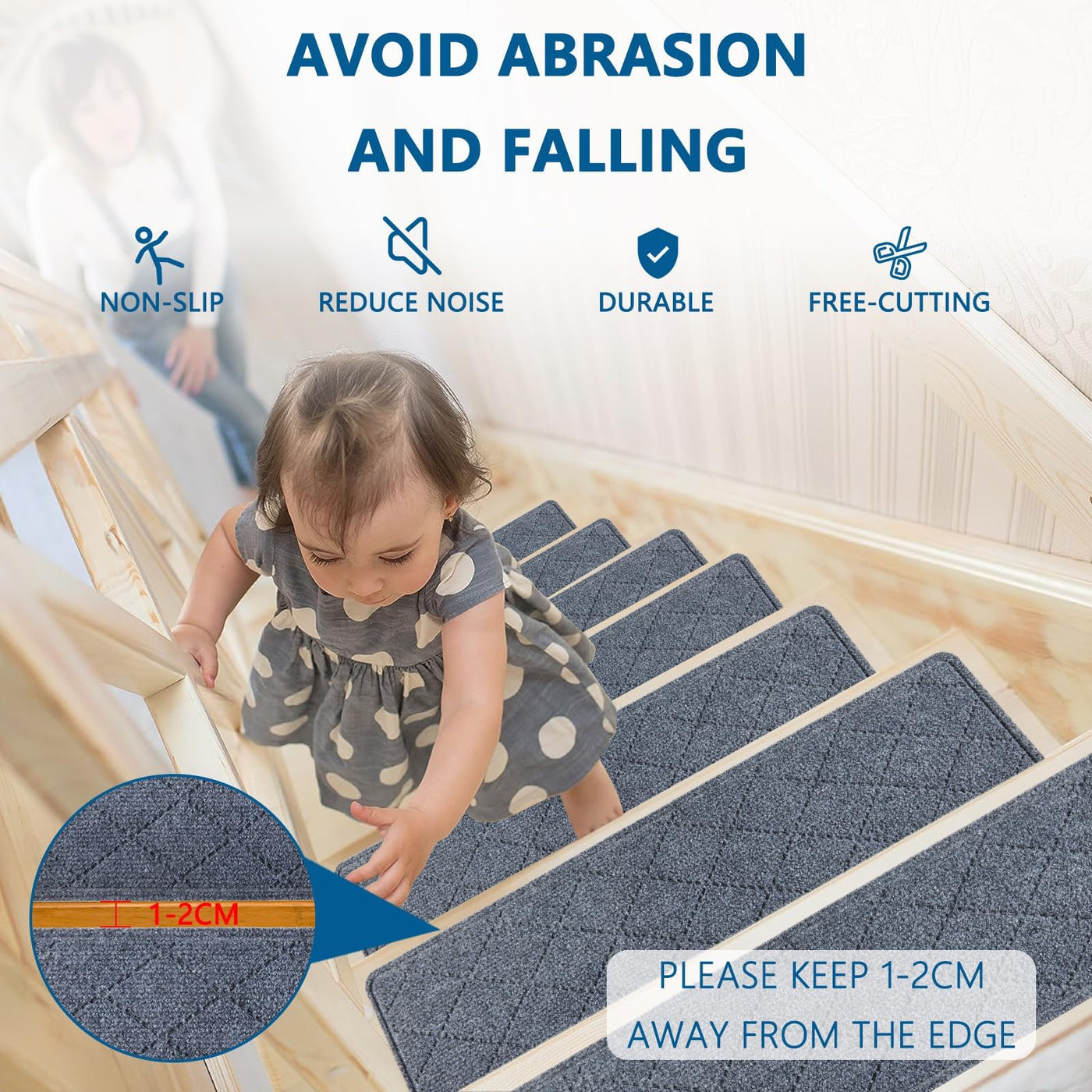 - 【Real material, Superior quality】 The surface of this non-slip stair treads mats is made of polyester material, which is soft and wear-resistant. The carpet stair treds is durable and does not easily pull and pile up. The proper thickness not only ensures that you can step comfortably on our stair step rugs, but also helps keep your feet out of the cold stairs. Reduce the noise of going up and down the stairs, giving your family a quiet and relaxing environment.