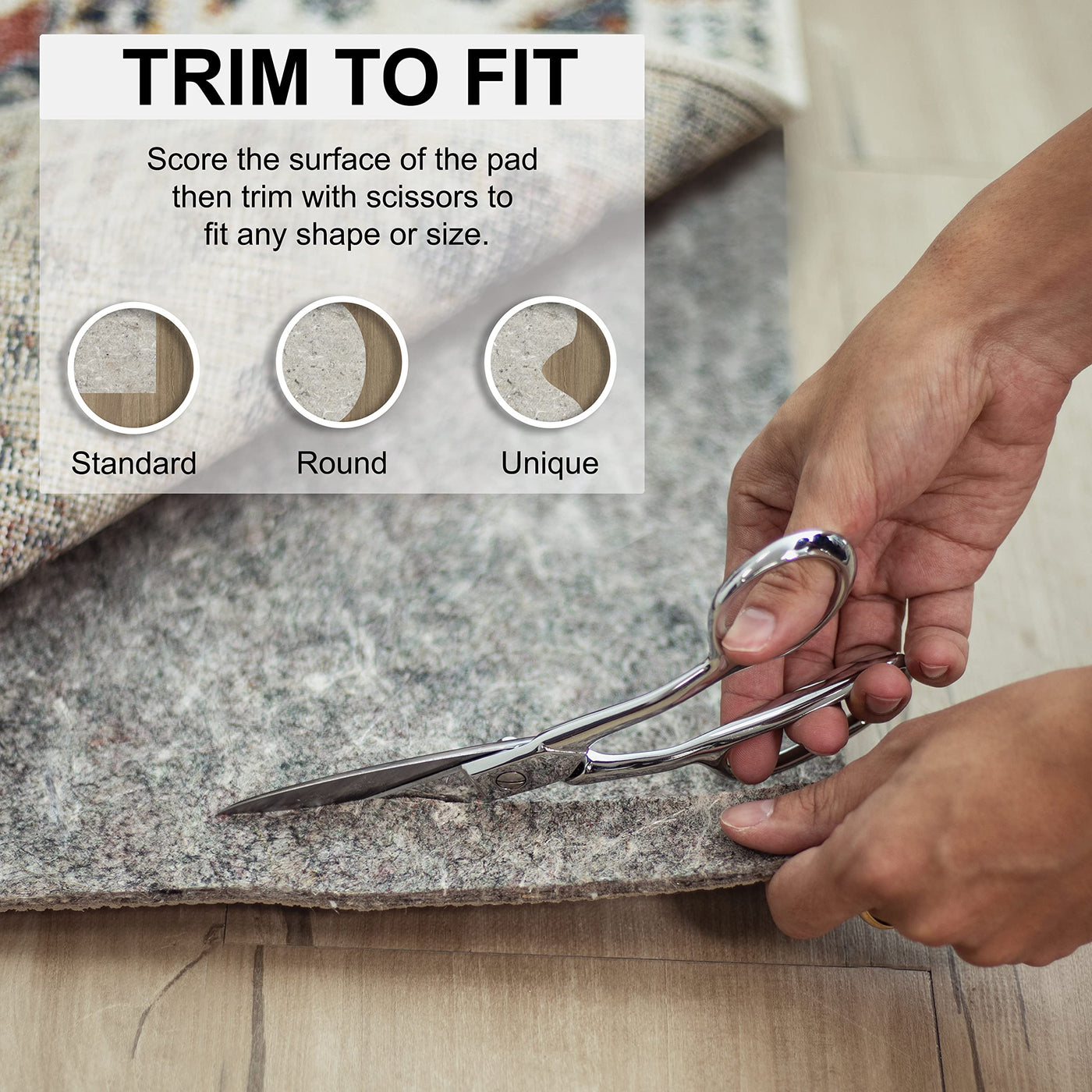 - CUSTOMIZABLE SIZING: Simply score the surface and trim your rug pad with scissors to fit any area rug size or shape. For the 3/8” and 1/2" thick rug pad options, it is recommended to trim the pad 2” short of your area rugs perimeter. For the 1/4" thick rug pad option, it is recommended to trim the pad 1” to 2” short of your area rugs perimeter.