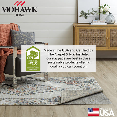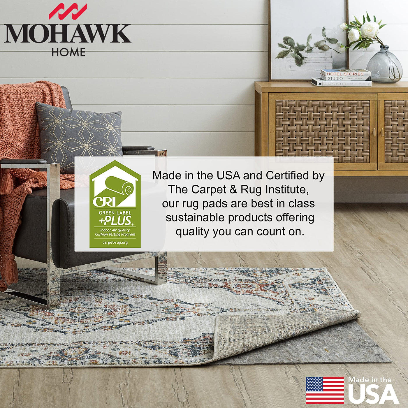Details: Balancing cushioned comfort and long-lasting protection, the Mohawk Home Dual Surface Rug Pad offers plush cushioning, non-slip grip, insulation, sound absorption, and superior flooring protection that is perfect for busy households. A great choice for all floor types, the durable blended felt fibers and non-slip latex backing is essential to keeping your rug attractive and in place and your floors damage free. Choose from three thickness options, 1/4", 3/8”, and 1/2" for the perfect amount of added area rug cushioning for any space in your home. Available in scatters, runners, and popular sizes such as 5x8, 6x9, and 8x10, this rug pad can also be easily customized using scissors to fit any size or shape. Our rug pads feature Green Label Plus Certification by The Carpet & Rug Institute, showcasing top quality products with the lowest chemical emissions on the market.