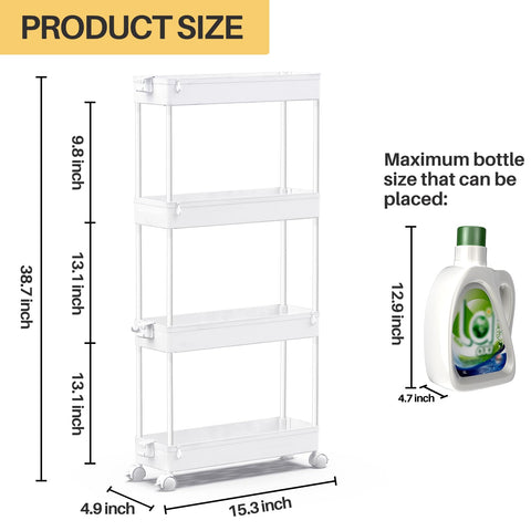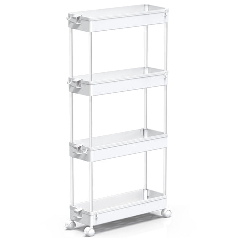 - 【Flexible 4 Tier Storage Cart】- The 4-tier slim storage cart is 4.75 in design which can be used in tight spaces in your home for storage. Suitable for closets, kitchens, bathrooms, garages, laundry rooms, offices or in-between your washer and dryer. Our entire storage cart is made of plastic. Please note that the wheels, hooks and rods are all made of plastic.