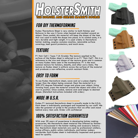 - 100% Satisfaction Guaranteed: With over 20 years of experience in developing holster making accessories, the thermoform sheet material line offered by HolsterSmith is unsurpassed in the holster making and accessory industry. Our thermoform sheet materials are used by professional soldiers, police officers, public safety individuals, and holster makers worldwide. Each Kydex sheet is individually inspected and guaranteed for quality.