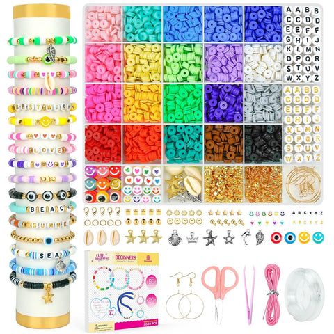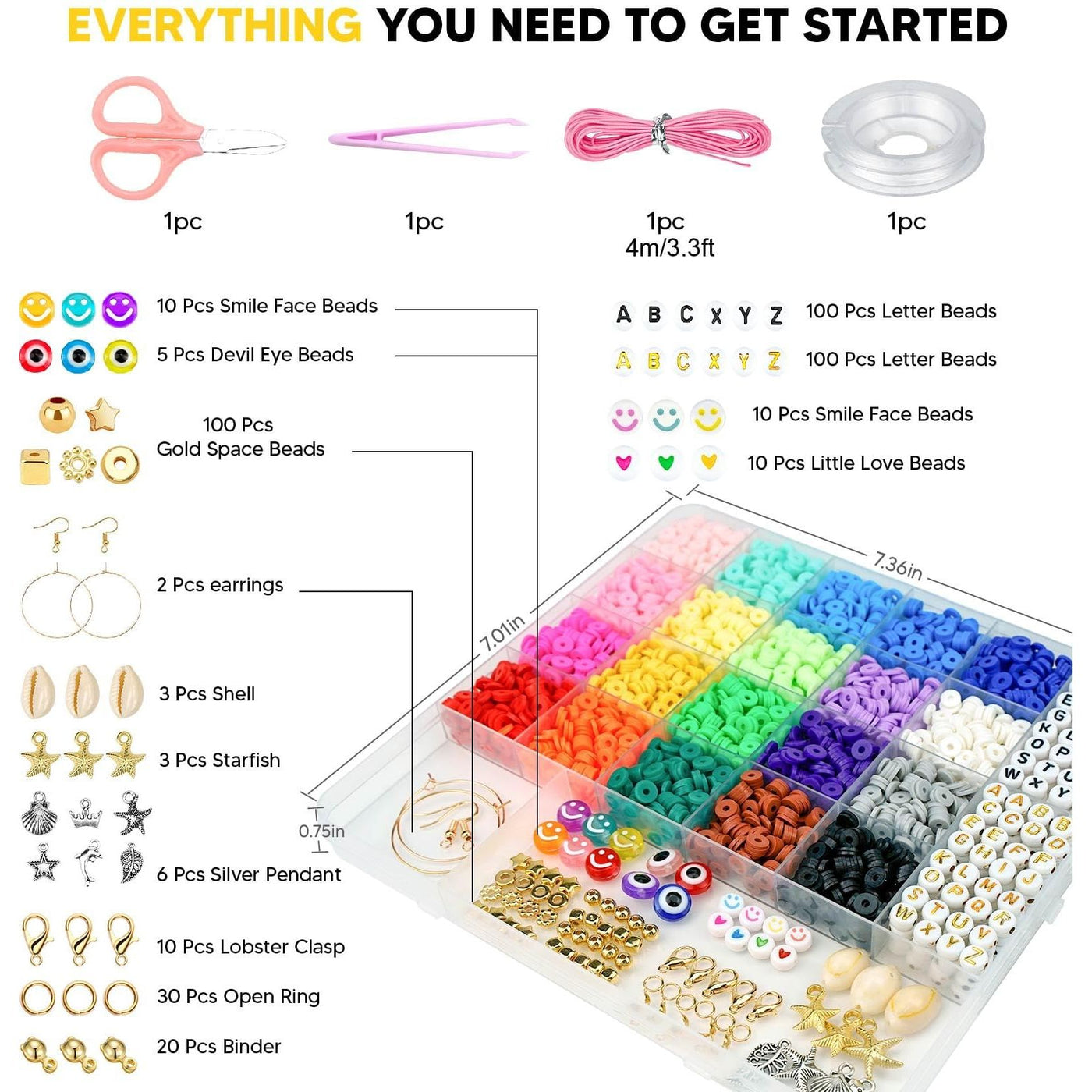 - 🌸Everything You Need to Get Started: This bead kit includes everything a beginner needs to start making beautiful bracelets and jewelry, including 4500 pcs flat polymer clay beads and 500 pcs charms kit (2 types random letter beads, smile face beads, golden spacer beads, golden shells, golden starfishes, silver pendant, lobster clasp set, etc.),1 rolls of 10 meters stretchy strings, scissors, tweezers. Let's start your new wonderful journey with the Dowsabel jewelry-making kit as the origin.