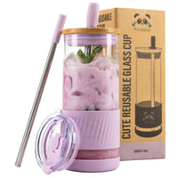 Pandaloo Glass Cups With Lids and Straws -20 Fl Oz- Perfect Size Iced Coffee Cup - Smoothie Cup With Bamboo Lid and On the go Lid - Glass Tumbler With Straw (1 Count (Pack of 1), Lilac Rhapsody)
