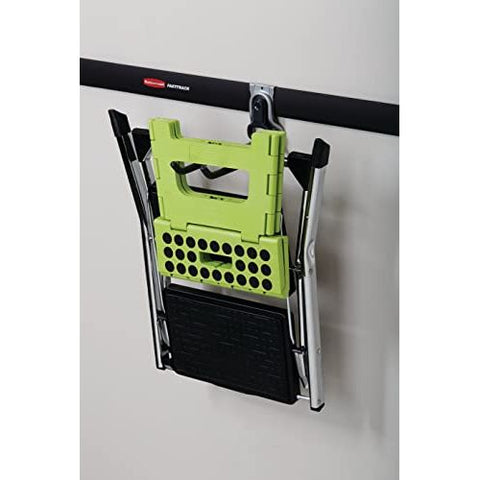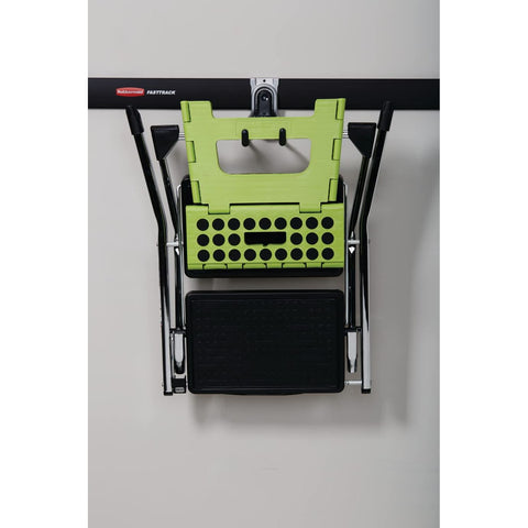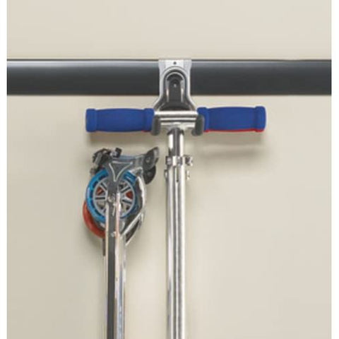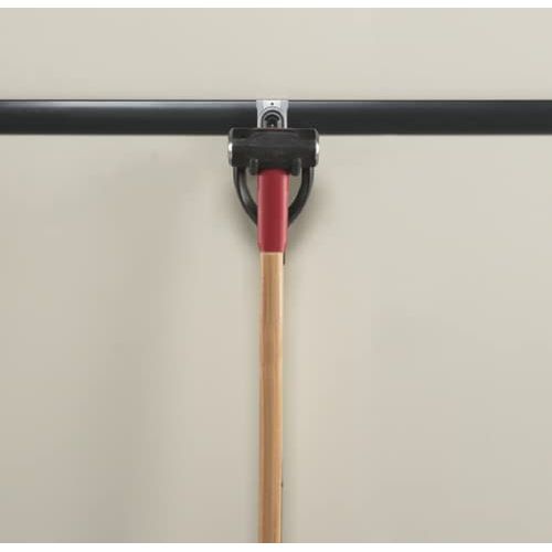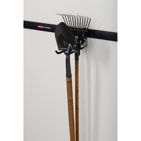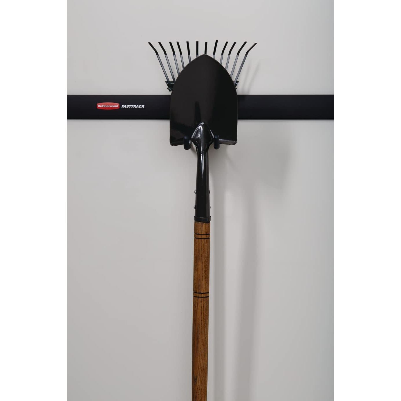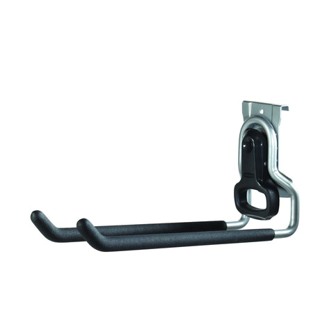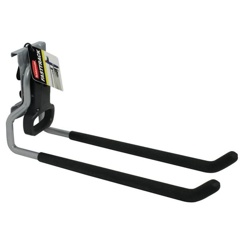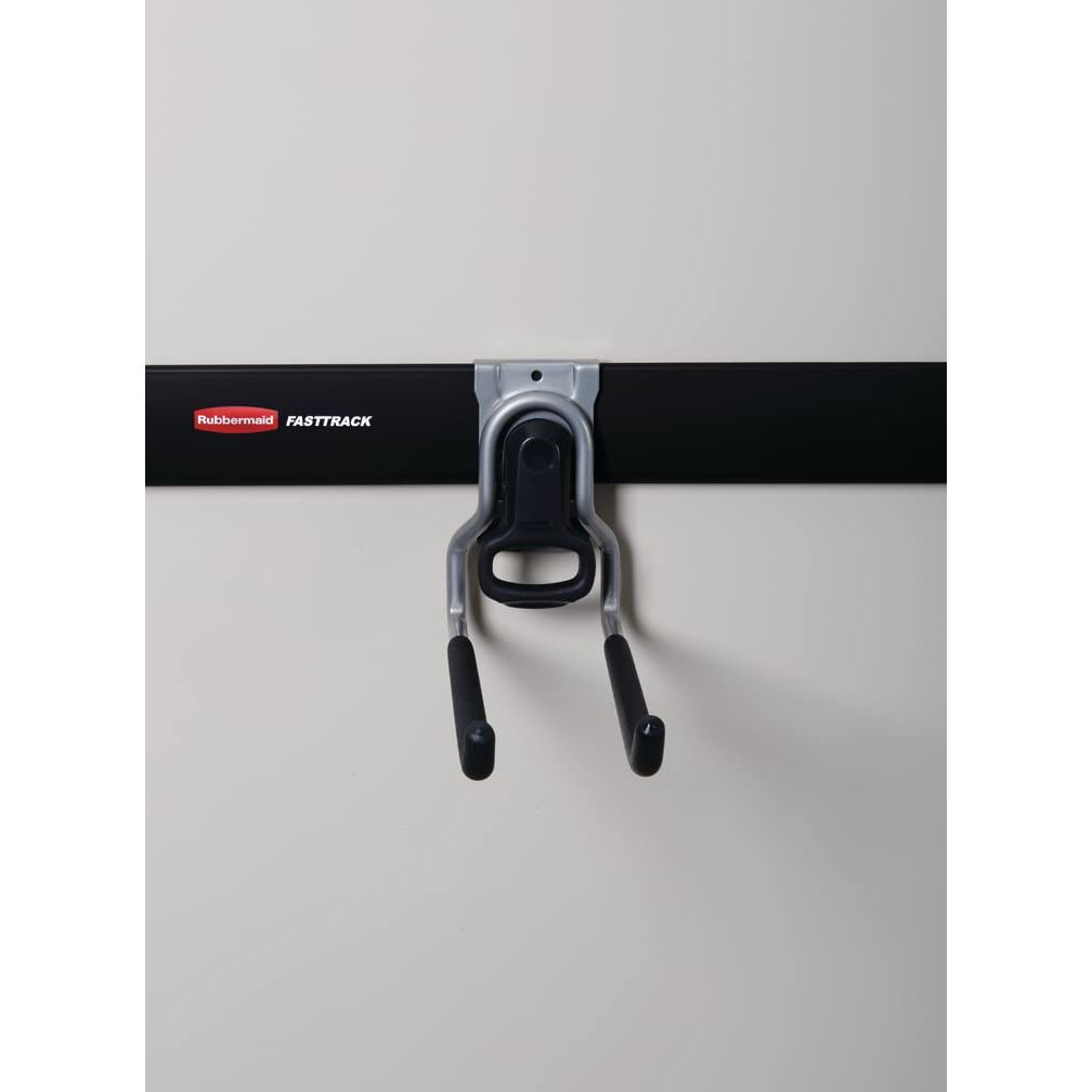 Long and strong enough to hang just about anything on, this multi-purpose wall hook keeps long-handle tools, scooters, and sports equipment in easy reach. Cords, lawn chairs, shovels, and kids toys; the hook holds up to 50 pounds and is equipped with a protective lip at the end so that items don't slip off and fall to the floor. Long-handle tools store upside down with spades and broom heads resting solidly between this hook's 2-bar design. Long-handle tools with perpendicular hand grips fit between the two bars right-side-up. The unit mounts easily to wall studs or to the Rubbermaid FastTrack rail (sold separately on Amazon.com along with a full line of FastTrack storage system components). The hook has a cast-aluminum gripper that snaps tightly into the FastTrack rail system. The hook is protected with a soft coating that won't scratch. The arm that extends out can be folded-up for safety when not in use. And, a satin nickel powder-coated finish won't rust, chip or crack for years of reliable storage. --Brian D. Olson