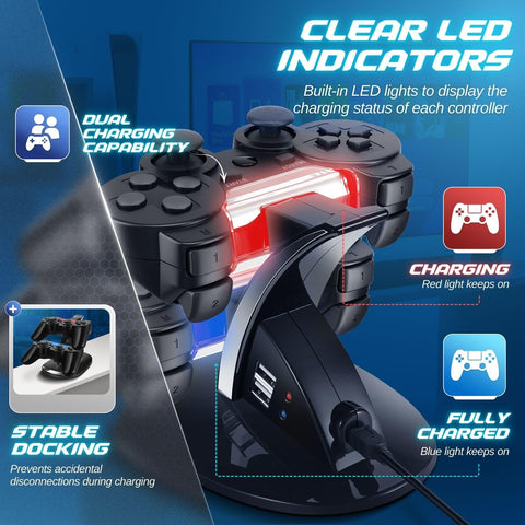 TNP Compatible with PS3 Controller Charger Stand for Sony Playstation 3 Controller compatible with Dualshock 3 Charging, 2 Tier Docking Station Stand and 2 USB PS3 Cable ports with LED Indicators
