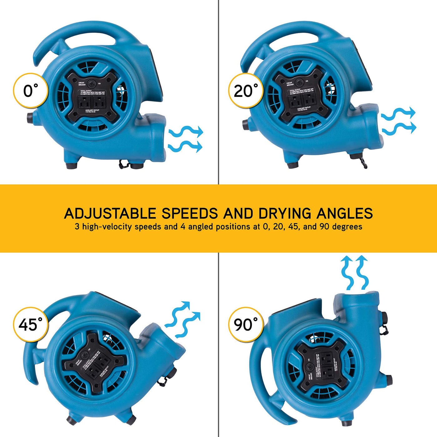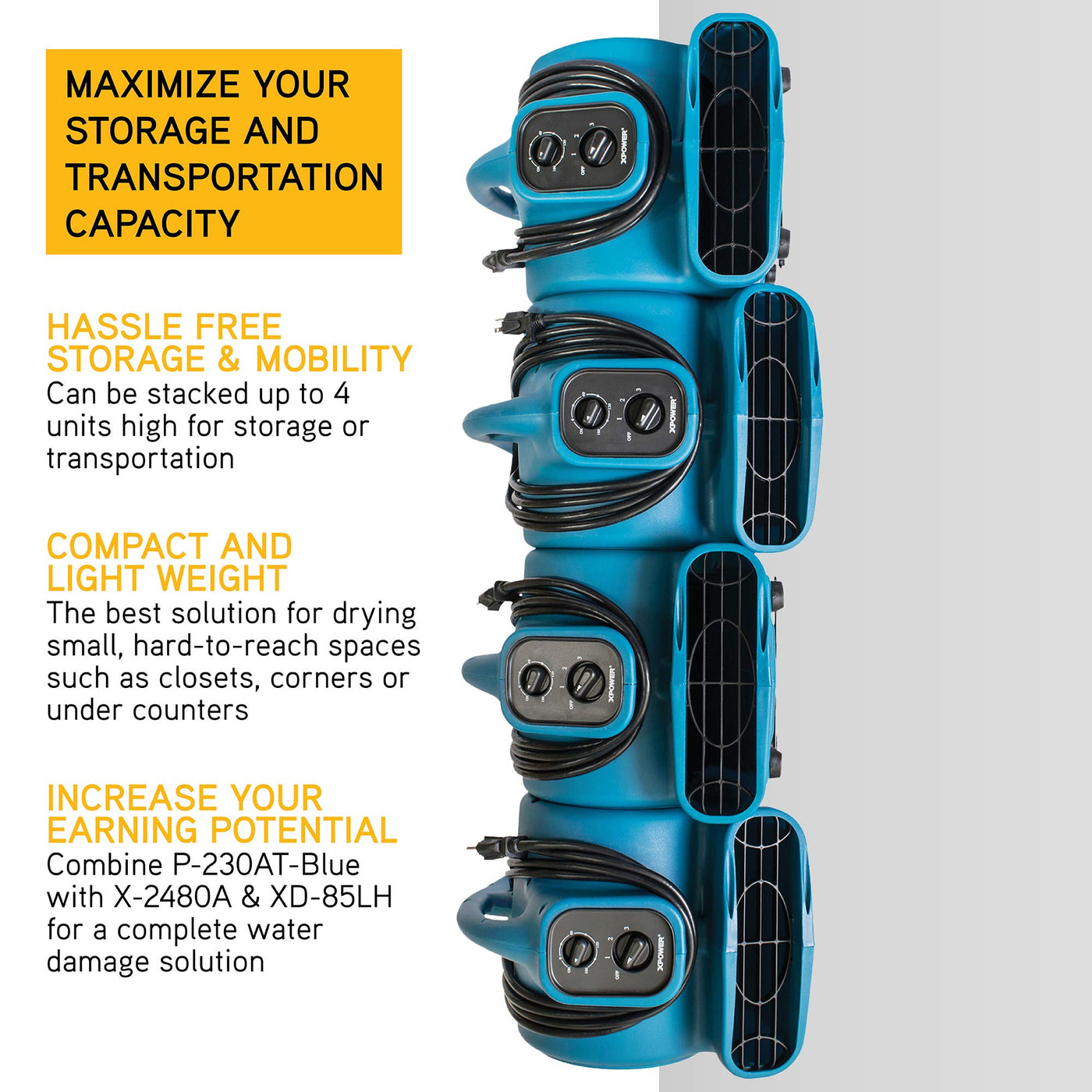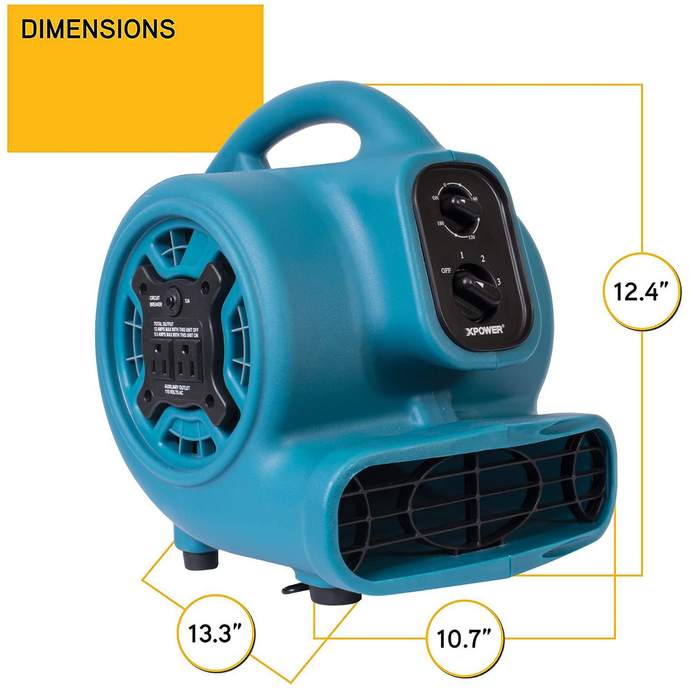 Details: Small yet mighty, the XPOWER P-230AT 1/4 HP 925 CFM 3-Speed Mini Air Move with Timer and Power Outlets produces a plentiful airflow capacity for small to large jobs in every size location. Weighing 10 lbs. 2 oz., this portable air mover is ideal for drying tight spaces, such as crawl spaces, under counters, inside cabinets, bathrooms, auto interiors, and more. With 2 onboard power outlets to connect several units together and a 3-hour timer, this unit is ideal for professional carpet cleaning, water damage restoration jobs or home use. The air mover is manufactured with rugged, state-of-the-art injection-mold technology, and its commercial-grade housing and motor will ensure optimum performance for years of service.